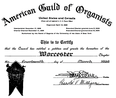 The American Guild of Organists ratified a petition and granted the formation of the Worcester Chapter on March 14, 1949. This resulted from the initiative of eight Worcester organists. Officers elected were Frederick Kinsley, Dean; Clifford Fowler Greene, Sub-Dean; Bertis H. Adams, Secretary; Luke H. Richard, Treasurer; Arvid C. Anderson, Auditor.